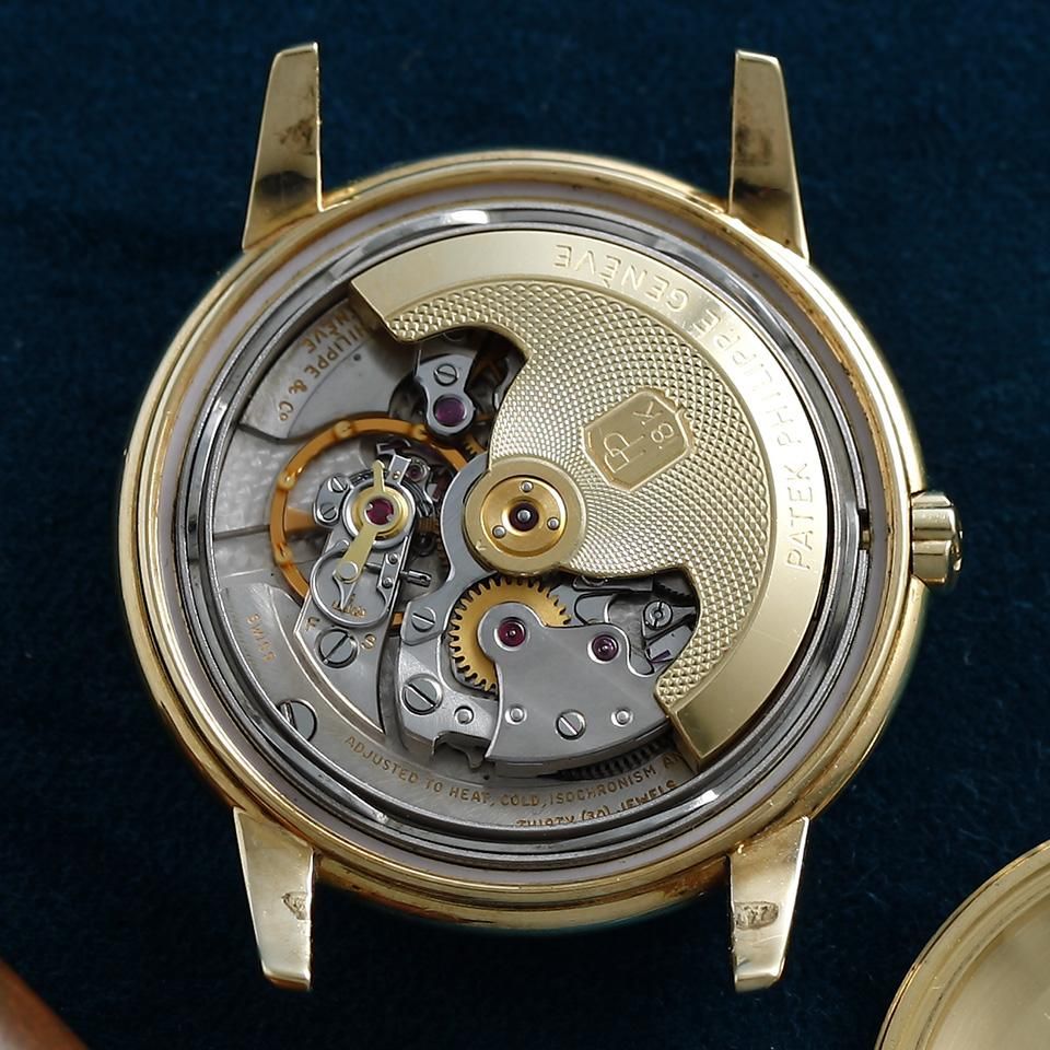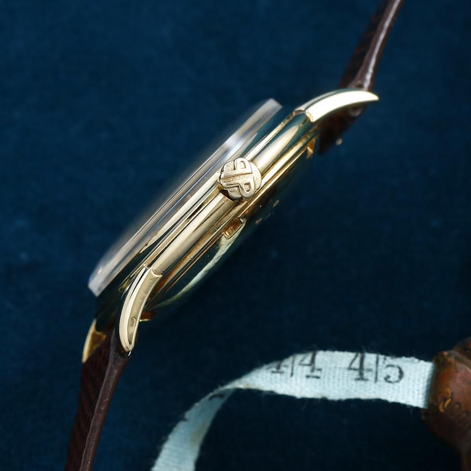 自動巻ムーブメントCal.12-600は、巻き上げ効率の向上を図ってローター素材に比重の重い18金無垢が採用され、美しくギョウシェ彫りされた贅沢な仕様になります。 パテックフィリップファンの方々羨望のRef.2526(通称:トロピカル)と同機種のこのキャリバーは1953年から1960年迄の僅かな年数に7099体しか生産されていません。緩急針と併用されるジャイロマックステンプの採用と、後期型の特徴であるローター軸やローター固定プレート等に幾つかの少変更が施されています。 この時代のスワンネックとチラシネジも、ムーブメントの美しさを象徴しています。このローターが回転するために山成りに膨らんだスクリューバックと、PPマークのリューズが特徴的です。