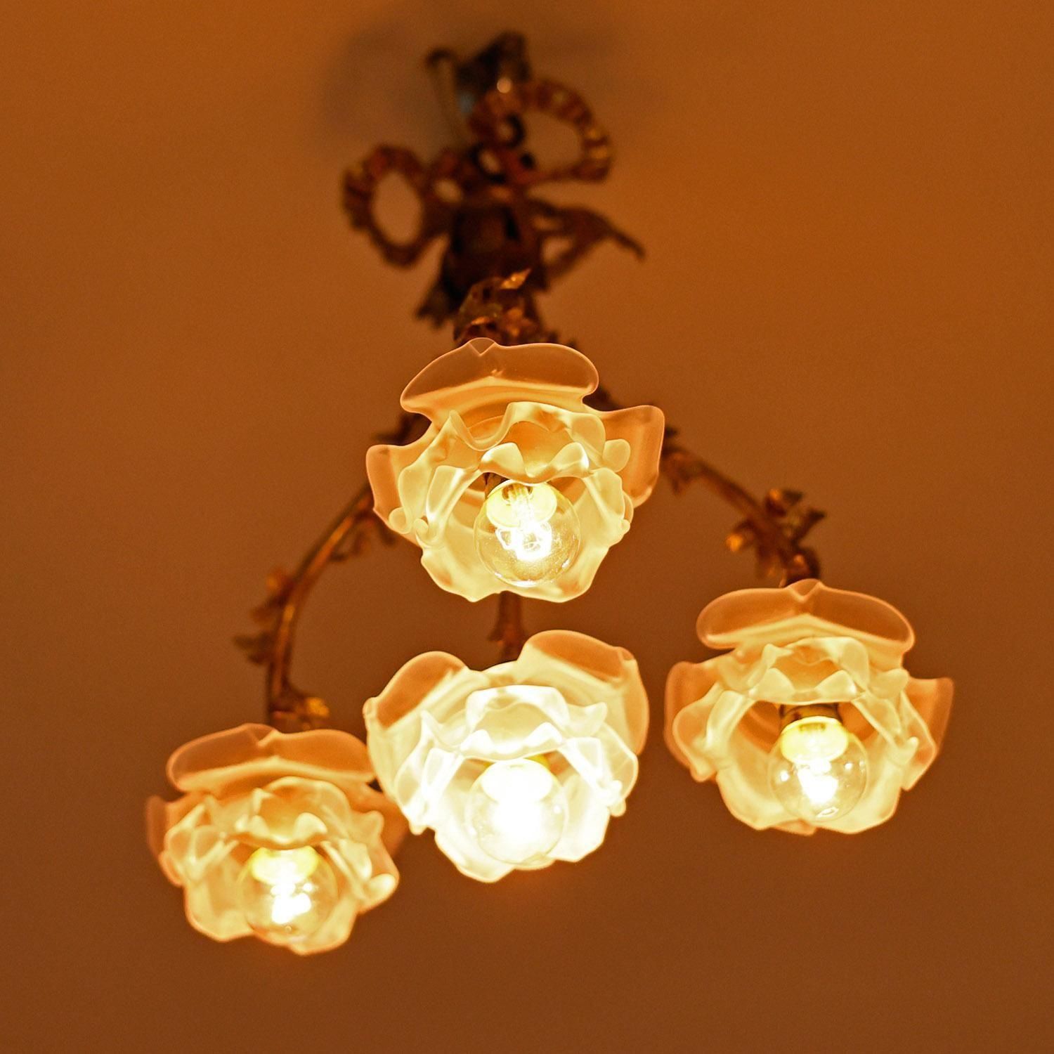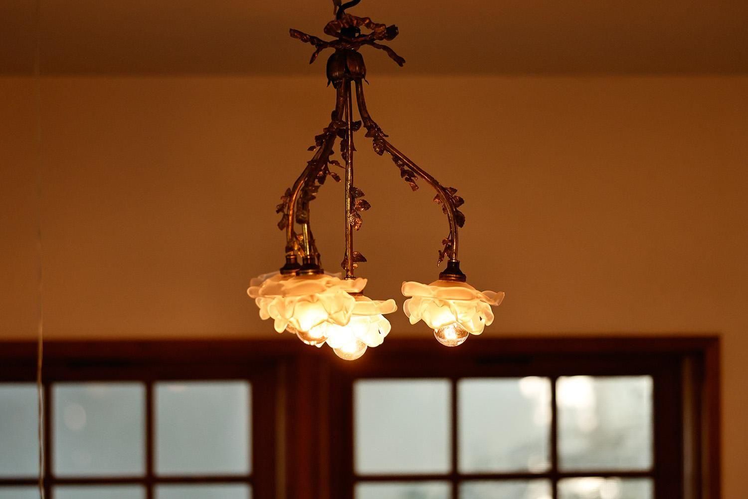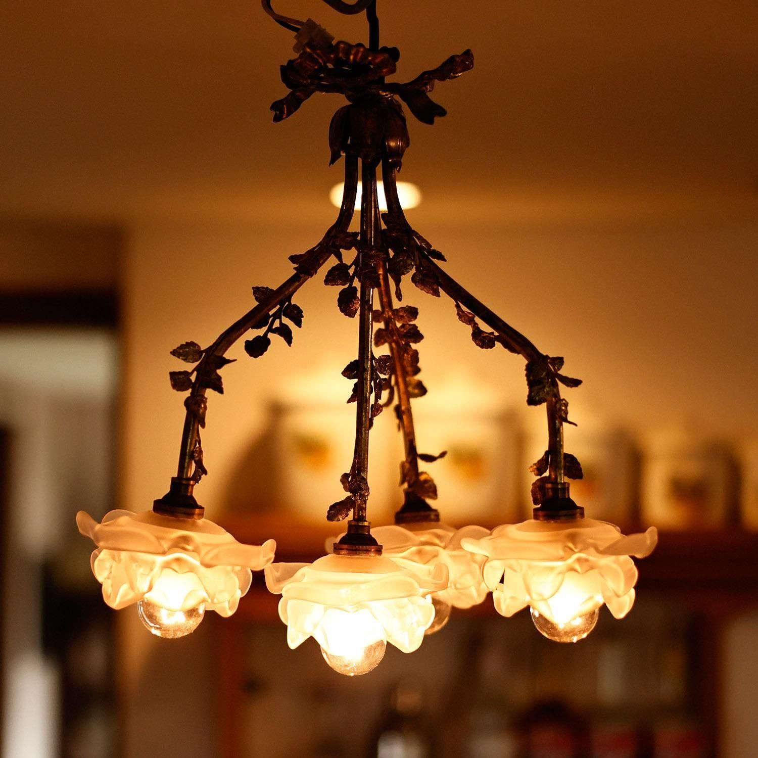 1920年代アールデコ期のシャンデリア。ブロンズとパート・ド・ヴェールの構成で、無銘のブロカント(民生品)として親しまれてきた照明です。全長で37cmと大変コンパクトなので、導線アプローチなど天井の低さで諦めていた方にもご検討頂けると思います。素朴なデザインの中にもディテールを感じられる素敵な一降りだと思います。