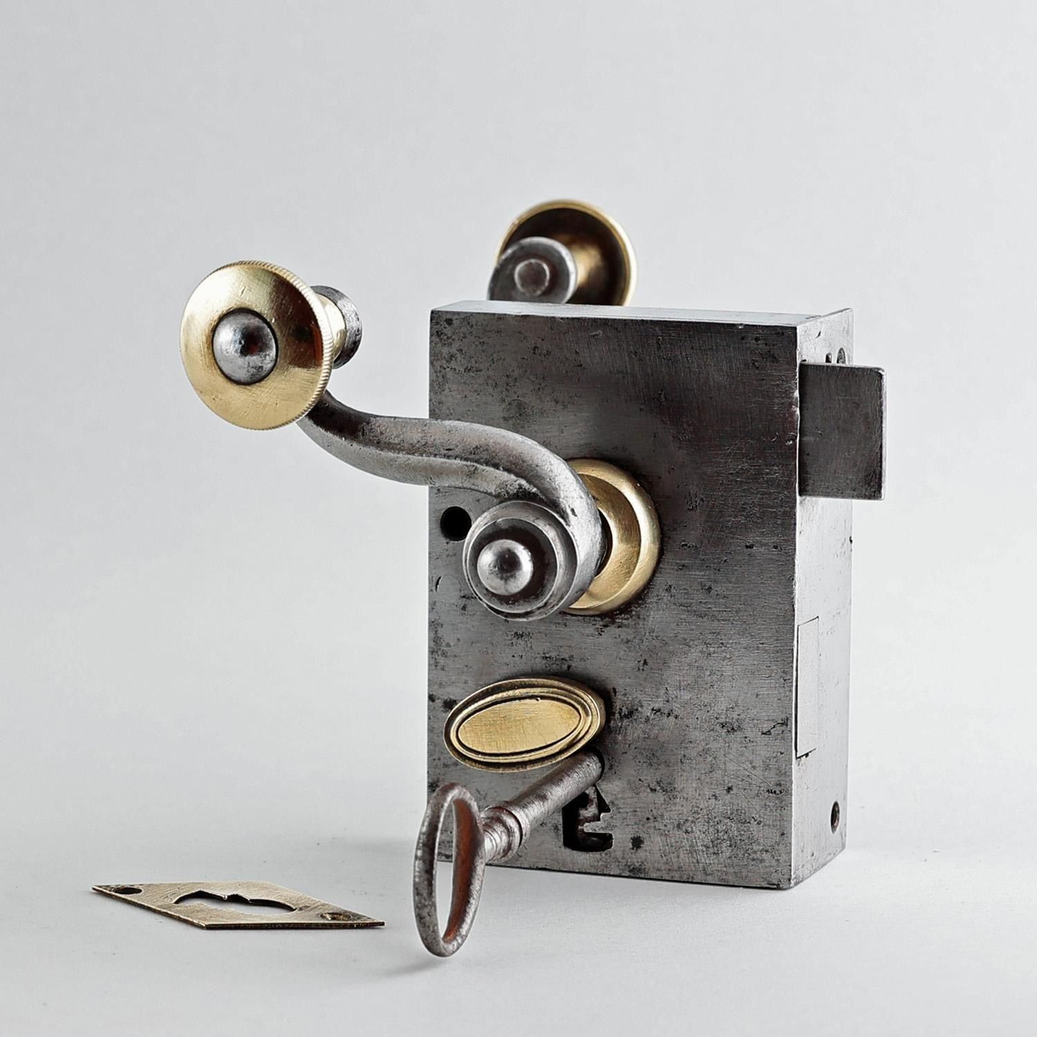 大きな外付けラッチのドアノブ。現地でも大変人気が高いインダストリアルロックです。ドア吊り元は右、内開きの仕様となります。座金付きですがノブ芯の位置は固定式です。ブロカントやインダストリアルがお好きな方にお薦めな金具です。